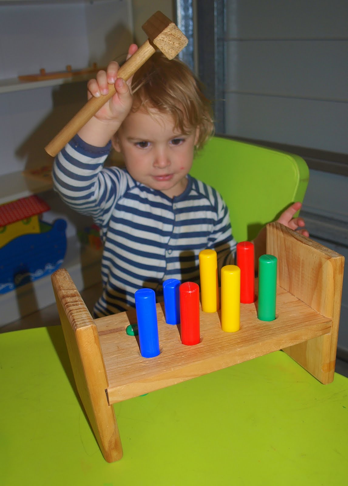He always chooses hammering from the shelves and loves this, although he particularly likes to have 'mummy do it' , I'm not sure if it is because I can make a louder noise or that I just get the little things hammered in faster than he does.